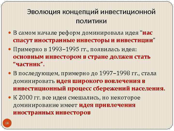 Эволюция концепций инвестиционной политики В самом начале реформ доминировала идея “нас спасут иностранные инвесторы и инвестиции” Примерно в 1993– 1995 гг. , появилась идея: основным инвестором в стране должен стать “частник”. В последующем, примерно до 1997– 1998 гг. , стала доминировать идея широкого вовлечения в инвестиционный процесс сбережений населения. К 2000 гг. все идеи смешались, но некоторое доминирование имеет идея привлечения иностранных инвесторов 18