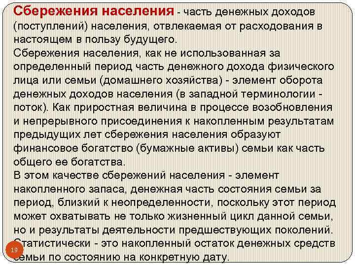 Сбережения населения - часть денежных доходов (поступлений) населения, отвлекаемая от расходования в настоящем в пользу будущего. Сбережения населения, как не использованная за определенный период часть денежного дохода физического лица или семьи (домашнего хозяйства) - элемент оборота денежных доходов населения (в западной терминологии - поток). Как приростная величина в процессе возобновления и непрерывного присоединения к накопленным результатам предыдущих лет сбережения населения образуют финансовое богатство (бумажные активы) семьи как часть общего ее богатства. В этом качестве сбережений населения - элемент накопленного запаса, денежная часть состояния семьи за период, близкий к неопределенности, поскольку этот период может охватывать не только жизненный цикл данной семьи, но и результаты деятельности предшествующих поколений. Статистически - это накопленный остаток денежных средств 19 семьи по состоянию на конкретную дату.
