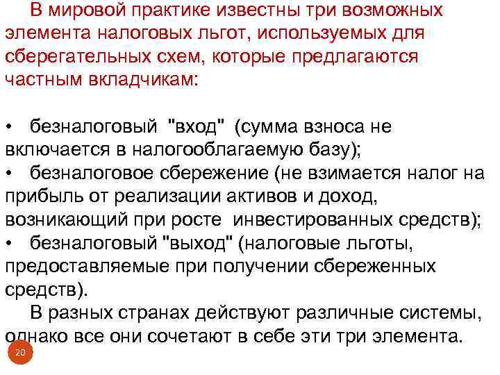 В мировой практике известны три возможных элемента налоговых льгот, используемых для сберегательных схем, которые предлагаются частным вкладчикам: • безналоговый "вход" (сумма взноса не включается в налогооблагаемую базу); • безналоговое сбережение (не взимается налог на прибыль от реализации активов и доход, возникающий при росте инвестированных средств); • безналоговый "выход" (налоговые льготы, предоставляемые при получении сбереженных средств). В разных странах действуют различные системы, однако все они сочетают в себе эти три элемента. 20