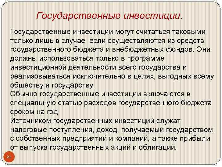 Государственные инвестиции могут считаться таковыми только лишь в случае, если осуществляются из средств государственного бюджета и внебюджетных фондов. Они должны использоваться только в программе инвестиционной деятельности всего государства и реализовываться исключительно в целях, выгодных всему обществу и государству. Обычно государственные инвестиции включаются в специальную статью расходов государственного бюджета сроком на год. Источником государственных инвестиций служат налоговые поступления, доход, получаемый государством с собственных предприятий и компаний, а также прибыли от выпуска государственных акций и облигаций. 21