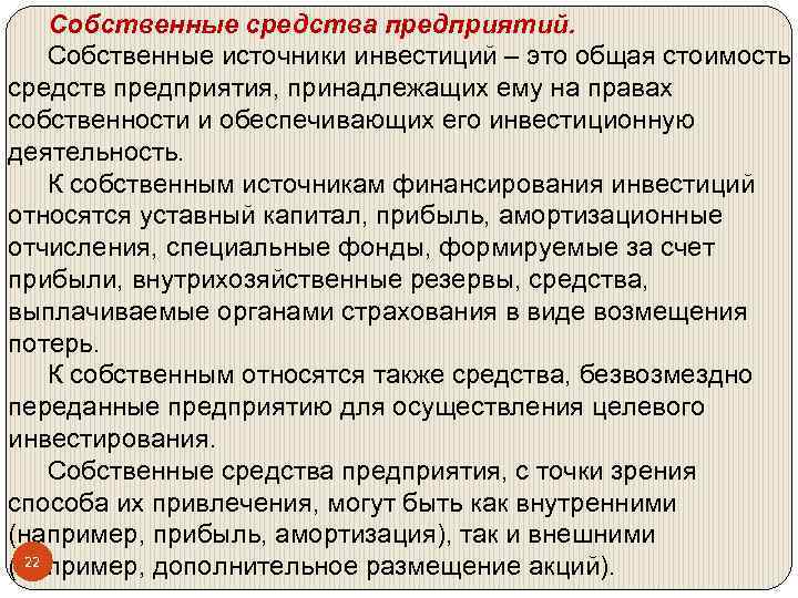 Собственные средства предприятий. Собственные источники инвестиций – это общая стоимость средств предприятия, принадлежащих ему на правах собственности и обеспечивающих его инвестиционную деятельность. К собственным источникам финансирования инвестиций относятся уставный капитал, прибыль, амортизационные отчисления, специальные фонды, формируемые за счет прибыли, внутрихозяйственные резервы, средства, выплачиваемые органами страхования в виде возмещения потерь. К собственным относятся также средства, безвозмездно переданные предприятию для осуществления целевого инвестирования. Собственные средства предприятия, с точки зрения способа их привлечения, могут быть как внутренними (например, прибыль, амортизация), так и внешними 22 (например, дополнительное размещение акций).