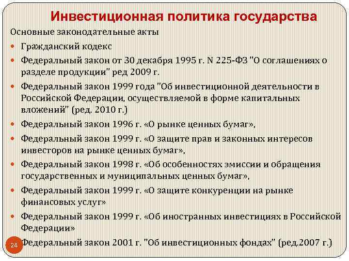 Инвестиционная политика государства Основные законодательные акты Гражданский кодекс Федеральный закон от 30 декабря 1995 г. N 225 -ФЗ "О соглашениях о разделе продукции" ред 2009 г. Федеральный закон 1999 года "Об инвестиционной деятельности в Российской Федерации, осуществляемой в форме капитальных вложений" (ред. 2010 г. ) Федеральный закон 1996 г. «О рынке ценных бумаг» , Федеральный закон 1999 г. «О защите прав и законных интересов инвесторов на рынке ценных бумаг» , Федеральный закон 1998 г. «Об особенностях эмиссии и обращения государственных и муниципальных ценных бумаг» , Федеральный закон 1999 г. «О защите конкуренции на рынке финансовых услуг» Федеральный закон 1999 г. «Об иностранных инвестициях в Российской Федерации» Федеральный закон 2001 г. "Об инвестиционных фондах" (ред. 2007 г. ) 24