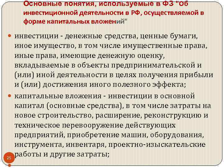 Основные понятия, используемые в ФЗ "Об инвестиционной деятельности в РФ, осуществляемой в форме капитальных вложений" инвестиции - денежные средства, ценные бумаги, иное имущество, в том числе имущественные права, иные права, имеющие денежную оценку, вкладываемые в объекты предпринимательской и (или) иной деятельности в целях получения прибыли и (или) достижения иного полезного эффекта; капитальные вложения - инвестиции в основной капитал (основные средства), в том числе затраты на новое строительство, расширение, реконструкцию и техническое перевооружение действующих предприятий, приобретение машин, оборудования, инструмента, инвентаря, проектно-изыскательские работы и другие затраты; 25