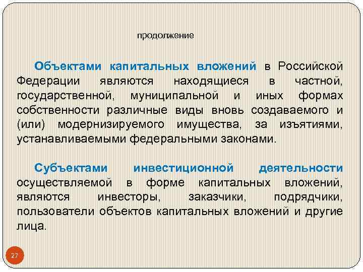 продолжение Объектами капитальных вложений в Российской Федерации являются находящиеся в частной, государственной, муниципальной и иных формах собственности различные виды вновь создаваемого и (или) модернизируемого имущества, за изъятиями, устанавливаемыми федеральными законами. Субъектами инвестиционной деятельности осуществляемой в форме капитальных вложений, являются инвесторы, заказчики, подрядчики, пользователи объектов капитальных вложений и другие лица. 27