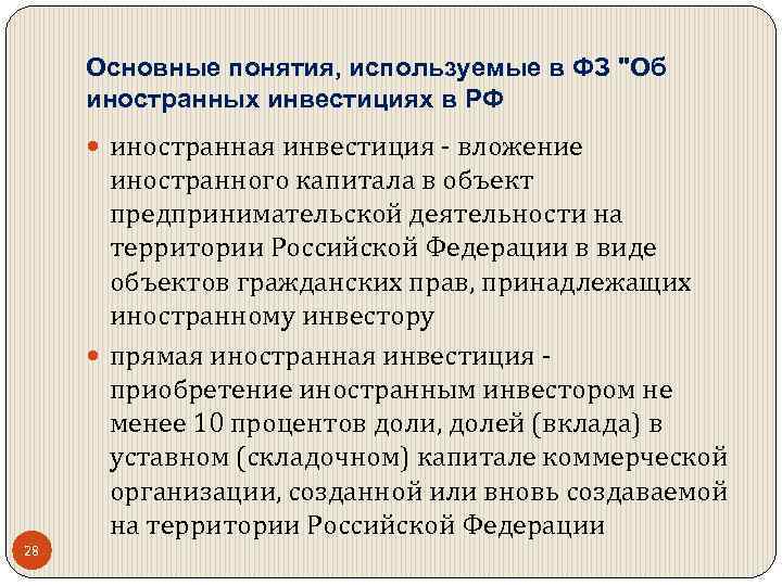 Основные понятия, используемые в ФЗ "Об иностранных инвестициях в РФ иностранная инвестиция - вложение иностранного капитала в объект предпринимательской деятельности на территории Российской Федерации в виде объектов гражданских прав, принадлежащих иностранному инвестору прямая иностранная инвестиция - приобретение иностранным инвестором не менее 10 процентов доли, долей (вклада) в уставном (складочном) капитале коммерческой организации, созданной или вновь создаваемой на территории Российской Федерации 28