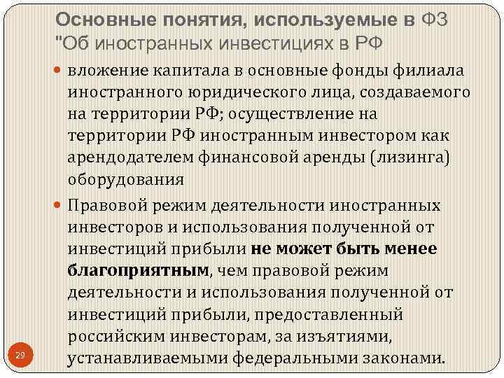 Основные понятия, используемые в ФЗ "Об иностранных инвестициях в РФ вложение капитала в основные фонды филиала 29 иностранного юридического лица, создаваемого на территории РФ; осуществление на территории РФ иностранным инвестором как арендодателем финансовой аренды (лизинга) оборудования Правовой режим деятельности иностранных инвесторов и использования полученной от инвестиций прибыли не может быть менее благоприятным, чем правовой режим деятельности и использования полученной от инвестиций прибыли, предоставленный российским инвесторам, за изъятиями, устанавливаемыми федеральными законами.