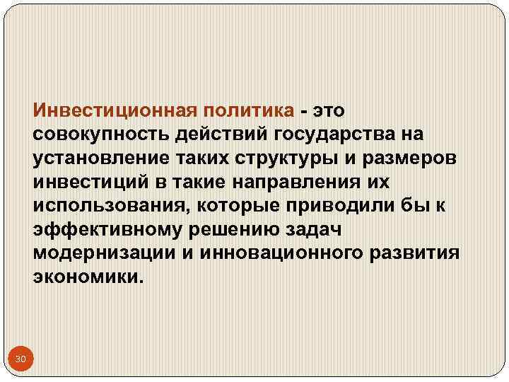 Инвестиционная политика - это совокупность действий государства на установление таких структуры и размеров инвестиций в такие направления их использования, которые приводили бы к эффективному решению задач модернизации и инновационного развития экономики. 30