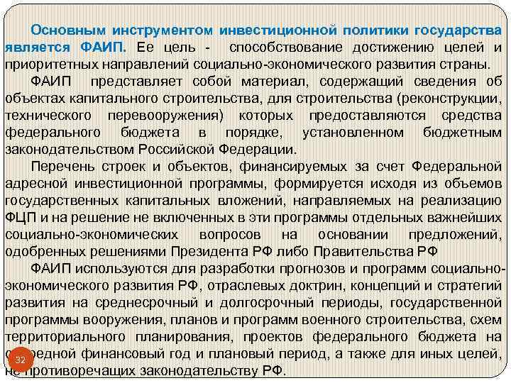 Инвестиционная политика государства Инструменты: Федеральная адресная инвестиционная программа (ФАИП) Федеральные целевые программы (ФЦП) Ведомственные целевые программы (ВЦП) 31