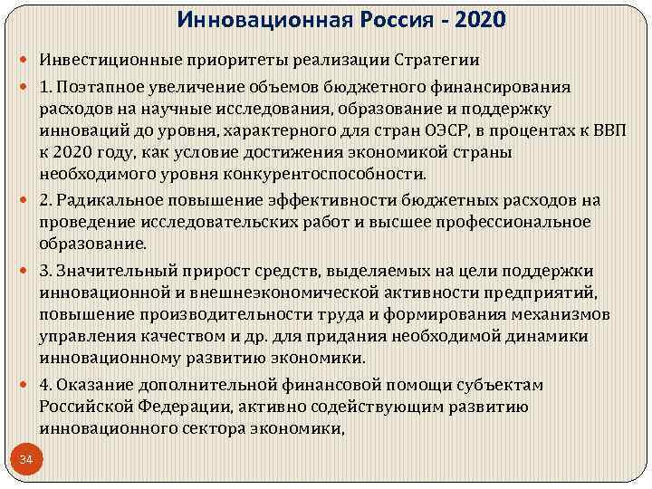 Инновационная Россия - 2020 Инвестиционные приоритеты реализации Стратегии 1. Поэтапное увеличение объемов бюджетного финансирования расходов на научные исследования, образование и поддержку инноваций до уровня, характерного для стран ОЭСР, в процентах к ВВП к 2020 году, как условие достижения экономикой страны необходимого уровня конкурентоспособности. 2. Радикальное повышение эффективности бюджетных расходов на проведение исследовательских работ и высшее профессиональное образование. 3. Значительный прирост средств, выделяемых на цели поддержки инновационной и внешнеэкономической активности предприятий, повышение производительности труда и формирования механизмов управления качеством и др. для придания необходимой динамики инновационному развитию экономики. 4. Оказание дополнительной финансовой помощи субъектам Российской Федерации, активно содействующим развитию инновационного сектора экономики, 34