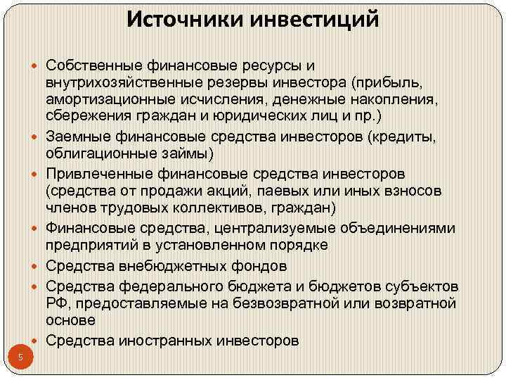 Источники инвестиций Собственные финансовые ресурсы и 5 внутрихозяйственные резервы инвестора (прибыль, амортизационные исчисления, денежные накопления, сбережения граждан и юридических лиц и пр. ) Заемные финансовые средства инвесторов (кредиты, облигационные займы) Привлеченные финансовые средства инвесторов (средства от продажи акций, паевых или иных взносов членов трудовых коллективов, граждан) Финансовые средства, централизуемые объединениями предприятий в установленном порядке Средства внебюджетных фондов Средства федерального бюджета и бюджетов субъектов РФ, предоставляемые на безвозвратной или возвратной основе Средства иностранных инвесторов