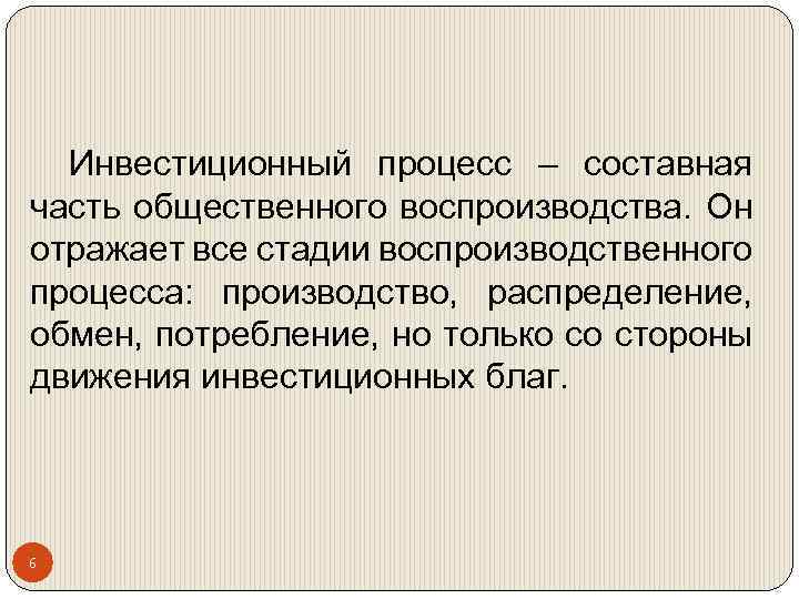 Инвестиционный процесс – составная часть общественного воспроизводства. Он отражает все стадии воспроизводственного процесса: производство, распределение, обмен, потребление, но только со стороны движения инвестиционных благ. 6
