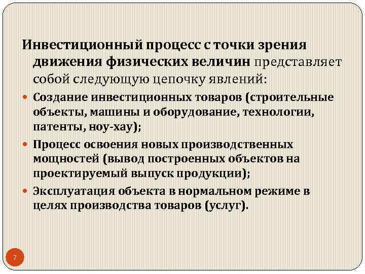 Инвестиционный процесс с точки зрения движения физических величин представляет собой следующую цепочку явлений: Создание инвестиционных товаров (строительные объекты, машины и оборудование, технологии, патенты, ноу-хау); Процесс освоения новых производственных мощностей (вывод построенных объектов на проектируемый выпуск продукции); Эксплуатация объекта в нормальном режиме в целях производства товаров (услуг). 7