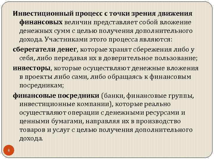 Инвестиционный процесс с точки зрения движения финансовых величин представляет собой вложение денежных сумм с целью получения дополнительного дохода. Участниками этого процесса являются: сберегатели денег, которые хранят сбережения либо у себя, либо передавая их в доверительное пользование; инвесторы, которые осуществляют денежные вложения в проекты либо сами, либо обращаясь к финансовым посредникам; финансовые посредники (банки, финансовые группы, инвестиционные компании), которые реально осуществляют операции с денежными ресурсами и ценными бумагами, направляя их в производство товаров и услуг с целью получения дополнительного дохода. 8