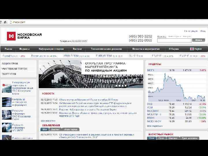 ОАО «Московская биржа» Создана в 2011 году в результате слияния ММВБ и РТС. Основные функции: 1) аккумулирование спроса и предложения на валютные ресурсы; 2) установление единого рыночного курса рубля по безналичным операциям банков; 3) обеспечение дополнительных гарантий при заключении валютных сделок; 4) организация торгов и заключение сделок по купле продаже иностранной валюты с участниками торгов; 5) организация и проведение расчетов в иностранной валюте и в рублях по сделкам; 6) определение текущего курса иностранных валют к рублю; 7) сбор и анализ информации о процессах, происходящих на валютном рынке.