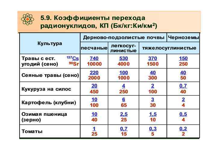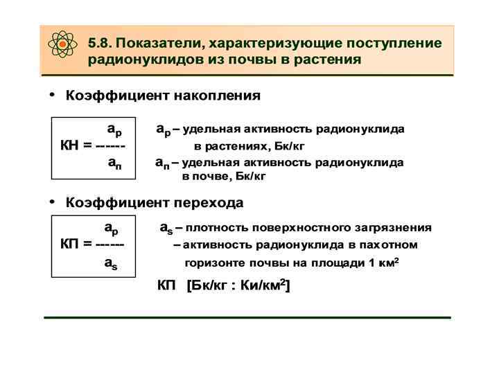 Используя КП РН из почв можно оценить • поступление РН в различные растения, рационы, а также молоко и мясо по формуле : • Апр = К • Qп, где • Апр – конц. РН в продукте, Бк/кг; • К – коэф. перехода РН из почвы в продукт, Бк/кг(продукта)/ Бк/м 2 ; • Qп – содержание РН в почве, Бк/м 2.