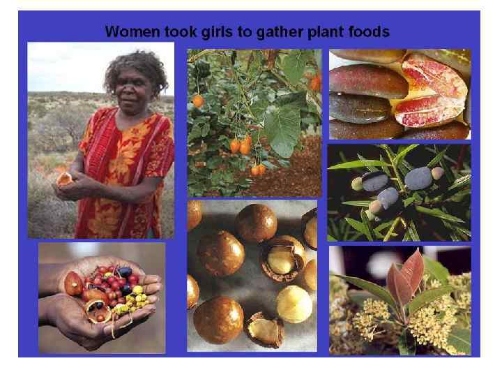 Вайпулданья из племени алава. Первобытная экономика (4). • Эффективность охоты в сравнении с собирательством. Ф. Роуз приводил наблюдения исследователя бушменов (так как не имел австралийского исследования): для мужчины вероятность удачной охоты была менее 25%, успех же женщины, собирающей раcтительную пищу, был гарантирован на 100%. • Поэтому, можно заключить, что пища у аборигенов Австралии была в основном растительного характера, причем стабильность ее поступления была намного выше, чем животной белковой пищи.