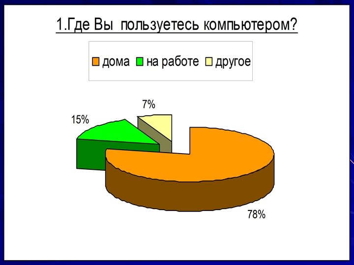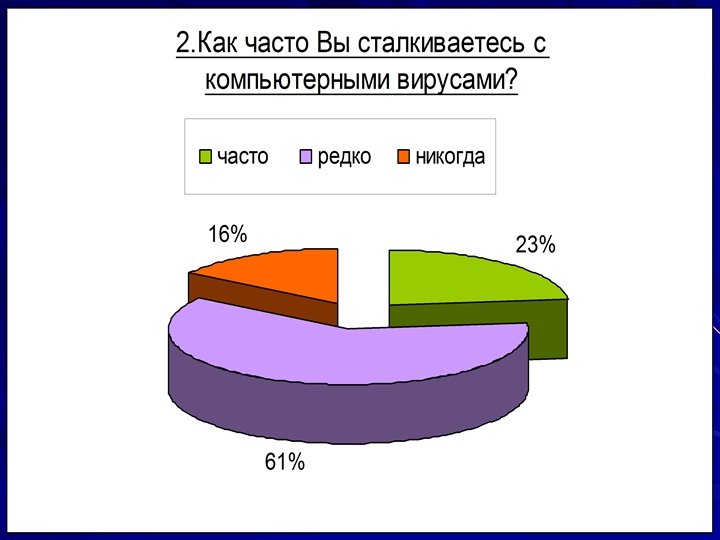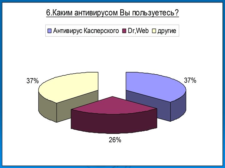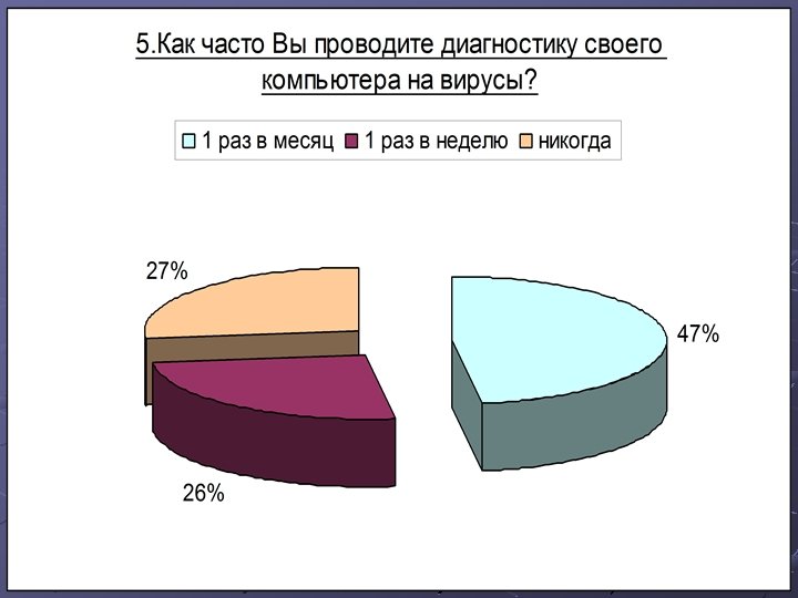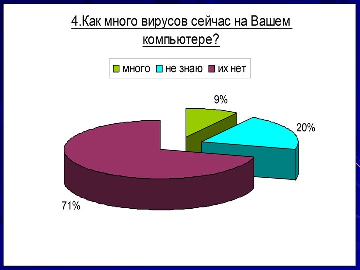 Приложение 2. Статистический опрос 1. Где Вы пользуетесь компьютером? 2. Как часто Вы сталкиваетесь с компьютерными вирусами? 3. Что Вы делали при встрече с вирусами? 4. Как много вирусов сейчас на Вашем компьютере? 5. Как часто Вы проводите диагностику своего компьютера на вирусы? 6. Каким антивирусом Вы пользуетесь?
