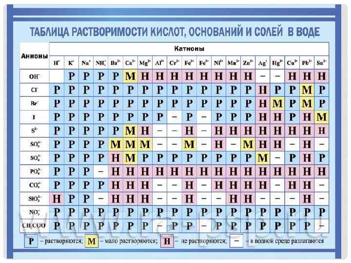 Для того чтобы определить растворимость веществ в воде, мы будем пользоваться таблицей растворимости солей, кислот и оснований в воде. В верхней строке таблицы – катионы, в левом столбце – анионы; ищем точку пересечения, смотрим букву – это и есть растворимость.