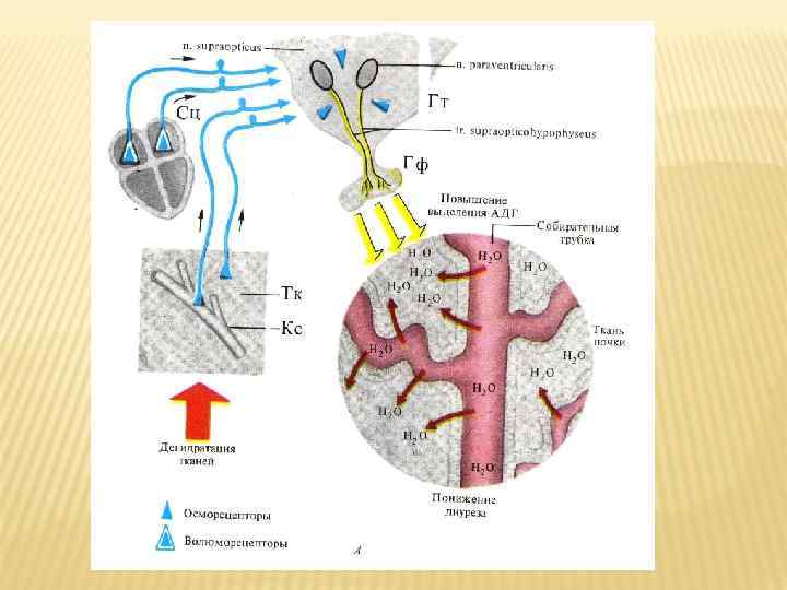 Строение и функции мочевыделительной системы При понижении осмотического давления крови уменьшается секреция вазопрессина и увеличивается диурез. Если выделение АДГ по каким-то причинам прекращается, то резко возрастает диурез (до 20 -25 л в сутки). Заболевание называется несахарный диабет. Гуморальная регуляция связана с деятельность нейрогипофиза и надпочечников. Нейрогипофиз уменьшает мочеобразование с помощью секреции избыточного количества вазопрессина, гормон мозгового вещества надпочечников адреналин так же уменьшает мочевыделение.