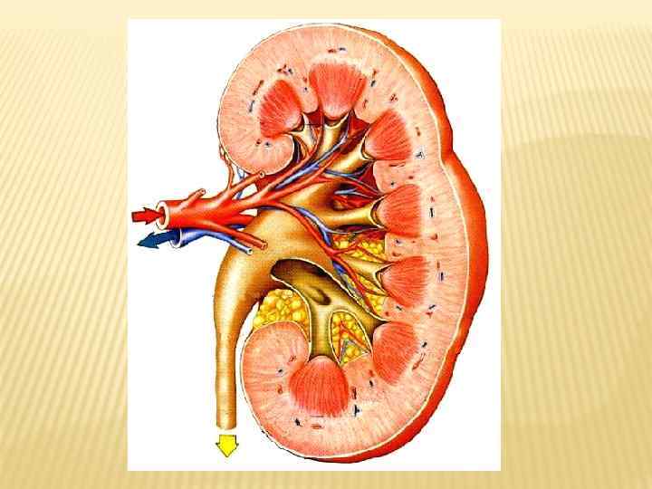 Строение и функции мочевыделительной системы В сосочках собирательные трубочки открываются в малые чашки (8 -9 штук), затем вторичная моча попадает в две большие чашки и затем в полость — почечную лоханку. Кровь попадает в почки из брюшной аорты через почечную артерию, очищенная выводится через почечную вену в нижнюю полую вену.