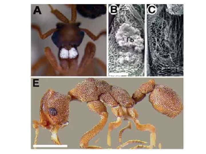 A — симбиотические бактерии на нижней стороне переднего сегмента груди муравья -листореза; B — колония бактерий в углублении на теле муравья; C — углубление, очищенное от бактерий; E — другой вид муравьялистореза, сплошь покрытый углублениями с симбиотическими бактериями (рис. из статьи в Science)