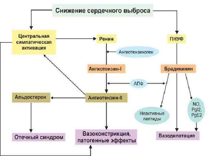 Патогенез. • Основыми патогенетическими факторами • • • хронической сердечной недостаточности есть: снижение сердечного выброса и перфузии органов тканей активация симпатоадреналовой системы, констрикция артериол и венул активация системи ренин – ангиотензин – альдостерон задержка натрию и воды Появление отеков.