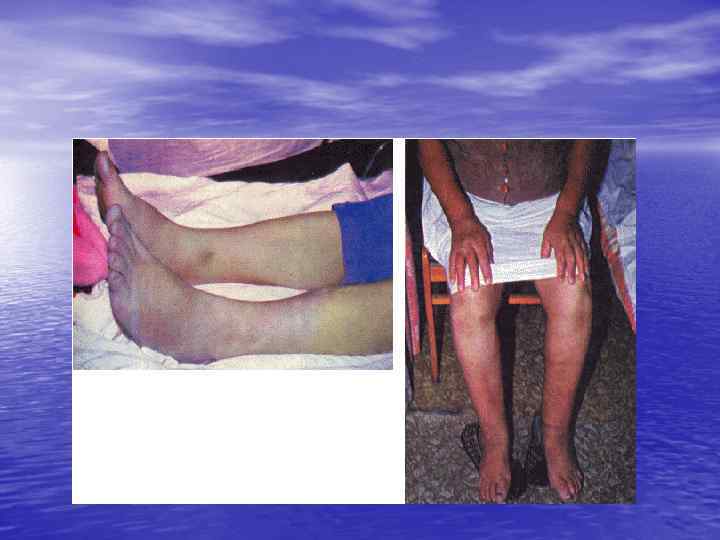 • СН ІІБ (конец длительной стадии) – признаки • застоя в обох кругах кровообращения постянные, полностью не исчезают при лечении. Одышка, серцебиение, прекардиальный дискомфорт появляються при наименьшем физическом напряжении и даже в покое. Трудоспособность резко снижена. Определяются застойные хрипы в легких, увеличение печени, набухание вен, постоянные отеки сначала на нижних конечностях, а потом и всего тела.