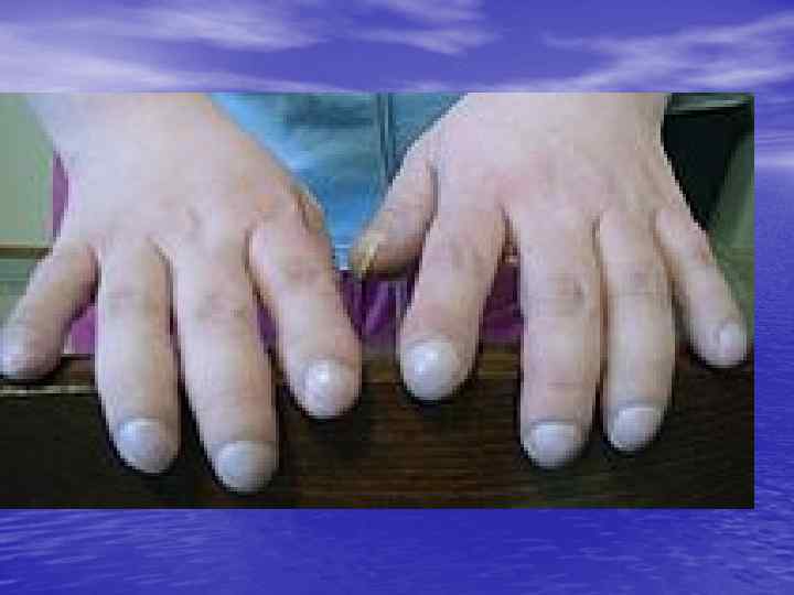 КЛИНИКА • Характерными клиническими признаками есть : • тяжелая дыхательная недостаточность, одышка, • • откашлеванние розовой пенистой мокроты, ортопное, бледная, покрыта холодным потом кожа. При осмотре - периферический цианоз. При аускультации выслушиваются влажные разного калибра хрипы над большей частью легких, тахикардия, протодиастолический ритм галопа та систолический шум над верхушкой, АД может повышатся или быть резко снижено (шок). При рентгенографии органов грудной клетки отмечается наличие синдрома «мокрых легких» . При исследовании газового состава крови определяется тяжелая или средней тяжести гипоксемия, гиперкапния, снижается р. Н артериальной крови (респіраторний ацидоз).