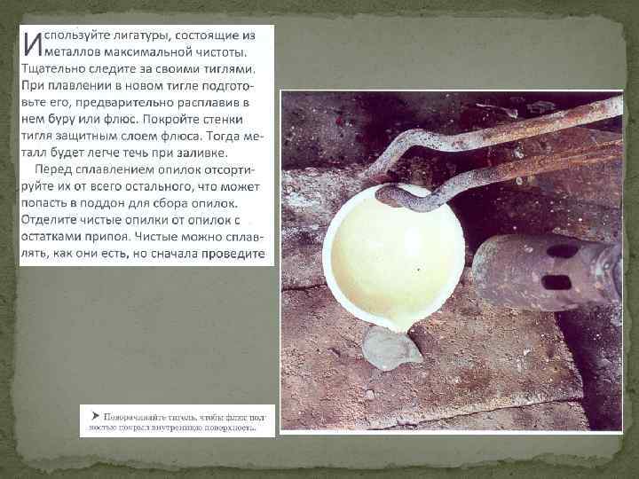 Бура (плавленая) используется в качестве флюса и защитного покрова при плавке драгоценных металлов. Обладает свойством хорошо отшлаковывать оксиды многих металлов и шлаковых включений. Расплавленная бура обладает хорошей смачиваемостью. Находясь в шихте, она обволакивает нерастворимые тугоплавкие включения и оксиды и поднимает их на поверхность. Переплавленную, мелкоистолченную и прокаленную при температуре 450 °С буру хранят в сухой посуде с притертой пробкой. В качестве флюса и защитного покрова бура может применяться для всех драгоценных металлов и сплавов, как самостоятельно, так и в сочетании с другими флюсами. Для лучшего скольжения расплава по стенкам бурой покрывают рабочую часть тигля. Борная кислота (плавленая) используется в качестве флюса при плавке золотых сплавов. Буру или борную кислоту засыпают на дно прогретого тигля до загрузки шихты, таким образом смачивая частицы металла до начала их окисления. Смесь поташа с бурой (1: 1 по массе) применяют как флюс при очистительных плавках. Смесь должна быть прокалена. Флюс вводят порциями. При загрязнении шихты нежелательны- ми металлами применяют смесь буры с калиевой или натриевой селитрами. При плавке драгоценных сплавов с селитрой можно повысить пробу сплава до 20 ед. При плавке с селитрой шихту нагревают под покровом буры до температуры отливки и в расплав двумя- тремя приемами вводят селитру. Другие флюсы — хлористый кальций, хлористый барий, хлористый натрий, хлористый калий — также применяют при очистительных плавках. Свойства и действие флюсов однотипны. Температура плавления 772. . . 925°С. Образуют хорошие защитные покровы для сплавов с температурой плавления до 1300°С. Хлористый кальций, хлористый барий, хлористый натрий или хлористый калий, как и буру, применяют в переплавленном, измельченном и прокаленном виде. Лучший раскислитель для золотых сплавов — цинк. Его вводят из расчета 0, 05. . . 0, 1 % от массы шихты. Для серебряных сплавов используют фосфористую медь