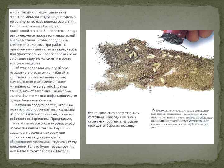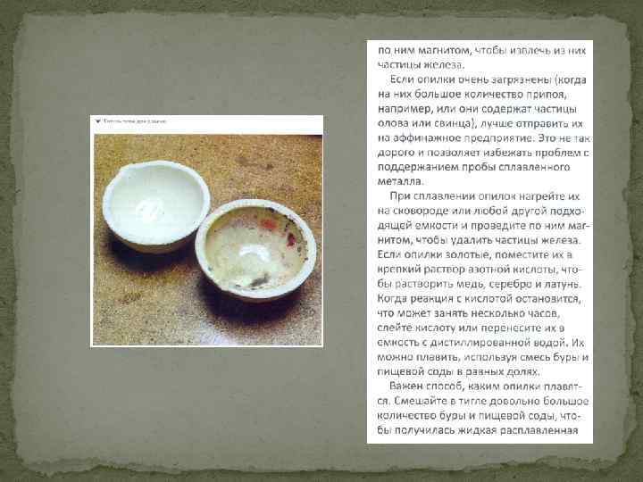 Материал, поступающий в плавку, называется шихтовым, или шихтой. Шихта может быть в виде чистых металлов, бракованных слитков и изделий, лома, обрезков, стружки и опилок и других отходов ювелирного производства. Шихтовый материал в зависимости от степени и характера загрязнения подвергается различной обработке. Отходы драгоценных металлов (опилки, мелкие обрезки, стружка), загрязненные в процессе работы, проходят очистительную обработку и только после этого поступают в плавку. Шихтовые материалы, загрязненные вредными примесями (металлами, не отвечающими составу сплава; материалами, отрицательно влияющими на свойства сплава, и т. д. ), подвергают предварительной плавке, а затем отправляют на аффинажные заводы или на заводы вторичных драгоценных металлов.