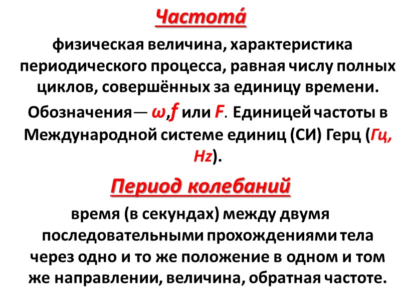 Частота́ физическая величина, характеристика периодического процесса, равная числу полных циклов, совершённых за единицу времени. Обозначения— ω,f или F. Единицей частоты в Международной системе единиц (СИ) Герц (Гц, Hz). Период колебаний время (в секундах) между двумя последовательными прохождениями тела через одно и то же положение в одном и том же направлении, величина, обратная частоте.