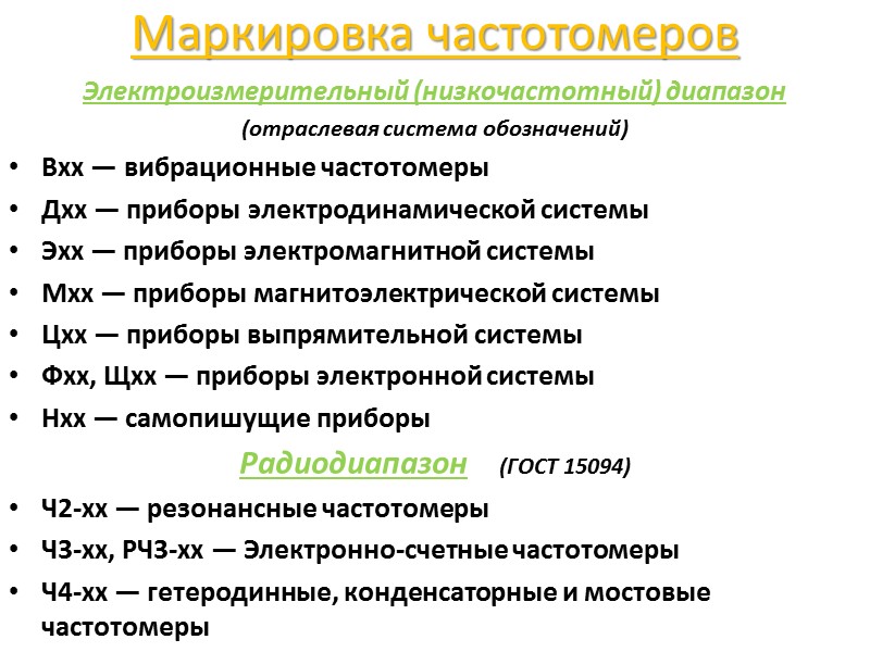 Маркировка частотомеров Электроизмерительный (низкочастотный) диапазон (отраслевая система обозначений) Вхх — вибрационные частотомеры Дхх — приборы электродинамической системы Эхх — приборы электромагнитной системы Мхх — приборы магнитоэлектрической системы Цхх — приборы выпрямительной системы Фхх, Щхх — приборы электронной системы Нхх — самопишущие приборы Радиодиапазон (ГОСТ 15094) Ч2-хх — резонансные частотомеры Ч3-хх, РЧ3-хх — Электронно-счетные частотомеры Ч4-хх — гетеродинные, конденсаторные и мостовые частотомеры