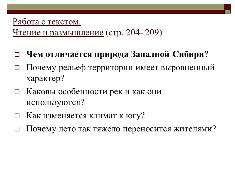 Работа с текстом. Чтение и размышление (стр. 204- 209) Чем отличается природа Западной Сибири? Почему рельеф территории имеет выровненный характер? Каковы особенности рек и как они используются? Как изменяется климат к югу? Почему лето так тяжело переносится жителями?