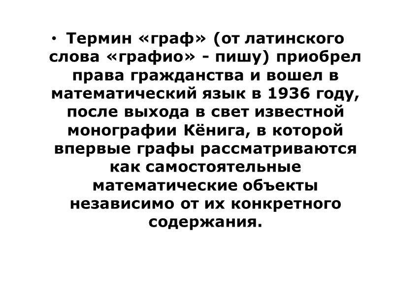 Термин «граф» (от латинского слова «графио» - пишу) приобрел права гражданства и вошел в математический язык в 1936 году, после выхода в свет известной монографии Кёнига, в которой впервые графы рассматриваются как самостоятельные математические объекты независимо от их конкретного содержания.