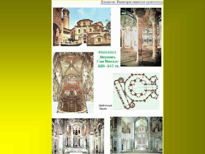 Характерные черты базилики Согласно христианским правилам, храм должен быть продолговатым, как корабль, обращенным на восток (в сторону Иерусалима, где ожидалось Второе пришествие Христа) и иметь в восточной части помещение для алтаря. • Внутреннее помещение делится колоннами на продольные проходы-нефы (от греч. «неус» «корабль» ) • Центральная часть обычно делалась высокой и перекрывалась двускатной крышей нефы • Окна располагались в верхней, возвышающейся части среднего нефа и обеспечивали хорошую и равномерную освещенность