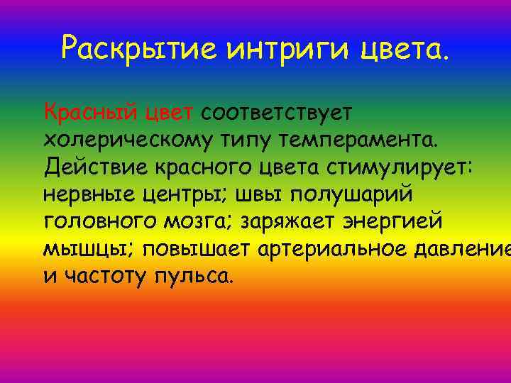 Раскрытие интриги цвета. Красный цвет соответствует холерическому типу темперамента. Действие красного цвета стимулирует: нервные центры; швы полушарий головного мозга; заряжает энергией мышцы; повышает артериальное давление и частоту пульса.