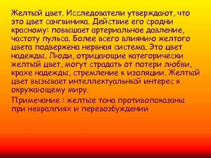 Желтый цвет. Исследователи утверждают, что это цвет сангвиника. Действие его сродни красному: повышает артериальное давление, частоту пульса. Более всего влиянию желтого цвета подвержена нервная система. Это цвет надежды. Люди, отрицающие категорически желтый цвет, могут страдать от потери любви, крахе надежды, стремление к изоляции. Желтый цвет вызывает интеллектуальный интерес к окружающему миру. Примечание : желтые тона противопоказаны при невралгиях и перевозбуждении