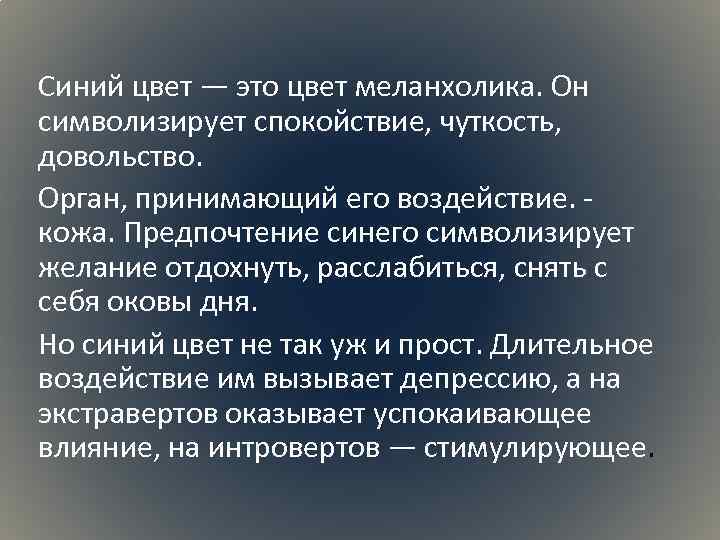 Синий цвет — это цвет меланхолика. Он символизирует спокойствие, чуткость, довольство. Орган, принимающий его воздействие. - кожа. Предпочтение синего символизирует желание отдохнуть, расслабиться, снять с себя оковы дня. Но синий цвет не так уж и прост. Длительное воздействие им вызывает депрессию, а на экстравертов оказывает успокаивающее влияние, на интровертов — стимулирующее.