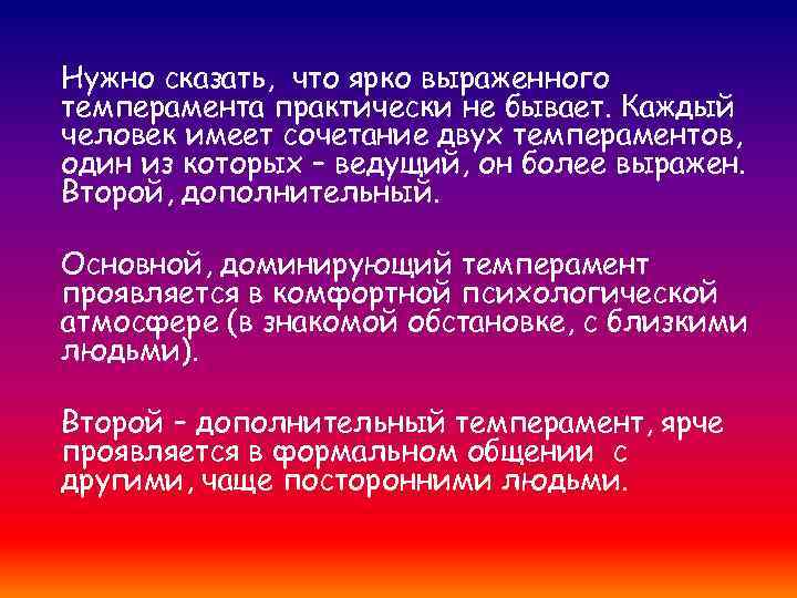 Нужно сказать, что ярко выраженного темперамента практически не бывает. Каждый человек имеет сочетание двух темпераментов, один из которых – ведущий, он более выражен. Второй, дополнительный. Основной, доминирующий темперамент проявляется в комфортной психологической атмосфере (в знакомой обстановке, с близкими людьми). Второй – дополнительный темперамент, ярче проявляется в формальном общении с другими, чаще посторонними людьми.