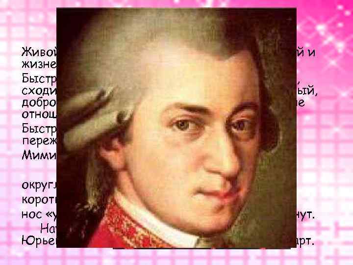 Сангвиник Живой, любознательный, подвижный, весёлый и жизнерадостный Быстро приспосабливается к новым условиям, сходится с людьми, общительный, приветливый, доброжелательный, легко налаживает хорошие отношения Быстро забывает обиды, сравнительно легко переживает неудачи Мимика богатая, подвижная, выразительная внешние признаки: округлые формы, низкий или средний рост; короткие, широкие кости и мышцы; нос «утиный» , «картошкой» или слегка вздернут. Наиболее известные сангвиники: Михаил Юрьевич Лермонтов, Вольфганг Амадей Моцарт.