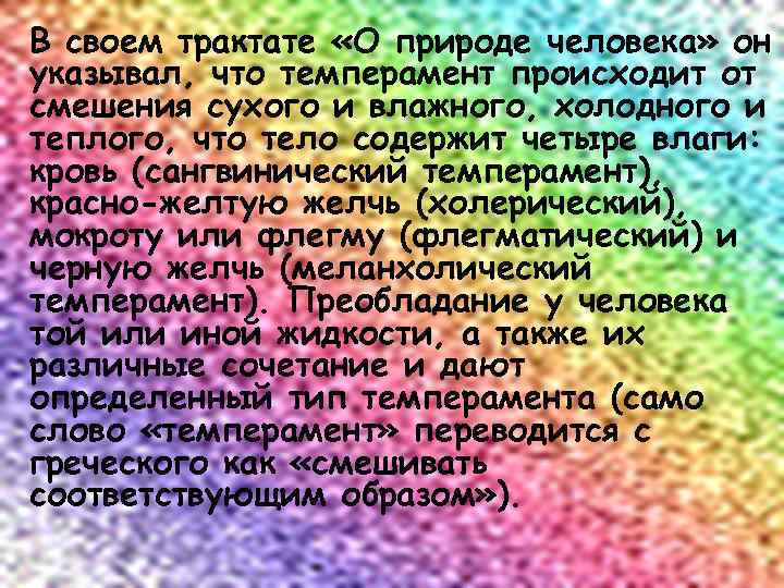 В своем трактате «О природе человека» он указывал, что темперамент происходит от смешения сухого и влажного, холодного и теплого, что тело содержит четыре влаги: кровь (сангвинический темперамент), красно-желтую желчь (холерический), мокроту или флегму (флегматический) и черную желчь (меланхолический темперамент). Преобладание у человека той или иной жидкости, а также их различные сочетание и дают определенный тип темперамента (само слово «темперамент» переводится с греческого как «смешивать соответствующим образом» ).