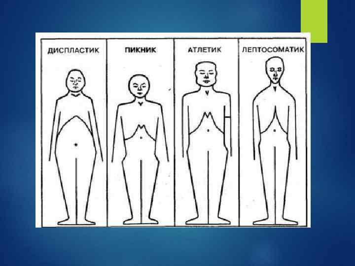 Лептосоматикбойшаң, нәзік денелі, тар иықты, қол-аяғы ұзын, сидыйған. Атлетик- бұлшық еттері күшті дамыған, денесі мығым, берік, ұзынша не орта бойлы, кең иықты, жамбас сүйектері тартылған Пикник- мығым, сезімшең, кіші не орта бойлы, қарны қампиған, домалақ бас. Диспластик-дене бітімі қисынсыз. Бұл адамдар әрқилы мүшелік зақымдарға ұшырағандар.