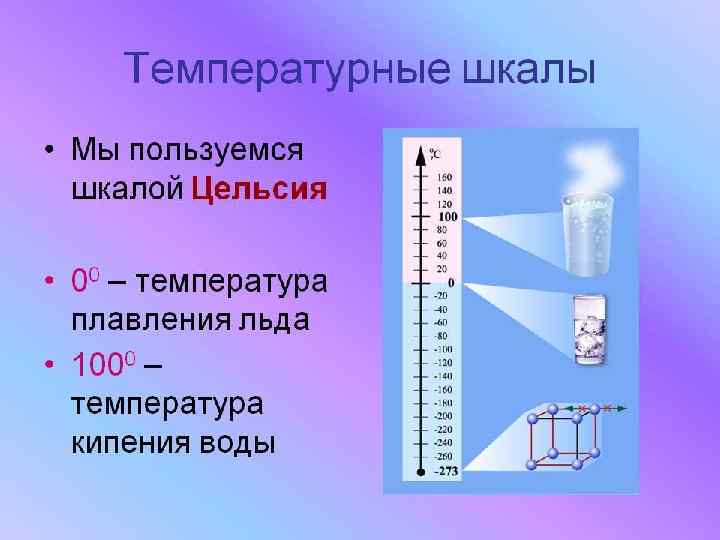 Шкала Цельсия. В температурной шкале Цельсия за начало отсчёта принята температура затвердевания воды (таяния льда), а интервал между температурами таяния льда и кипения воды при нормальном атмосферном давлении (101325 паскалей или 760 мм рт. ст. ) разделён на 100 равных частей (n = 100). Название данная шкала получила в честь предложившего её (в 1742) шведского учёного А. Цельсия (A. Celsius, 1701— 44). Температура по шкале Цельсия выражается в градусах Цельсия (°С), при этом температура таяния льда принимается равной 0°С, кипения воды 100°С.