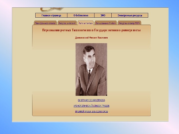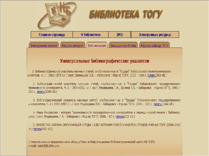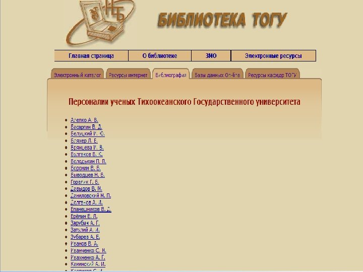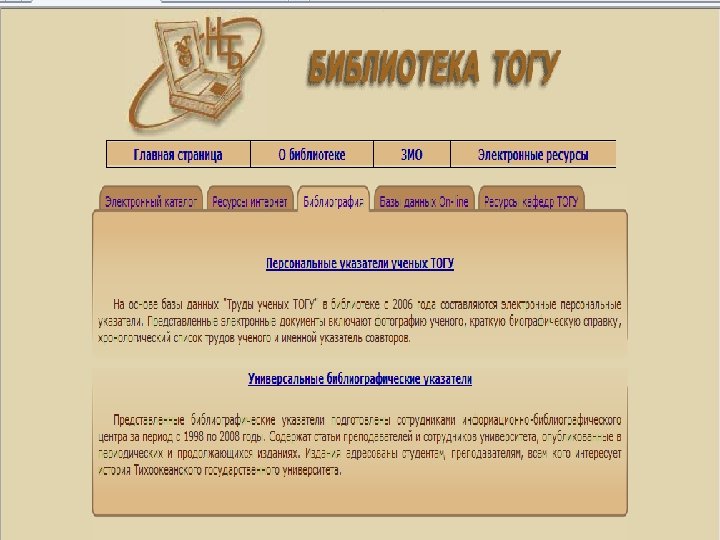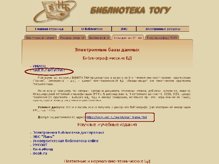 Библиотека ТОГУ с 2005 г. предоставляет доступ к библиографическим базам данных Государственной публичной научно-технической библиотеки (ГПНТБ СО РАН): • История Сибири и Дальнего Востока • Экономика Сибири и Дальнего Востока • Природа и природные ресурсы Сибири и Дальнего Востока, их охрана и рациональное использование