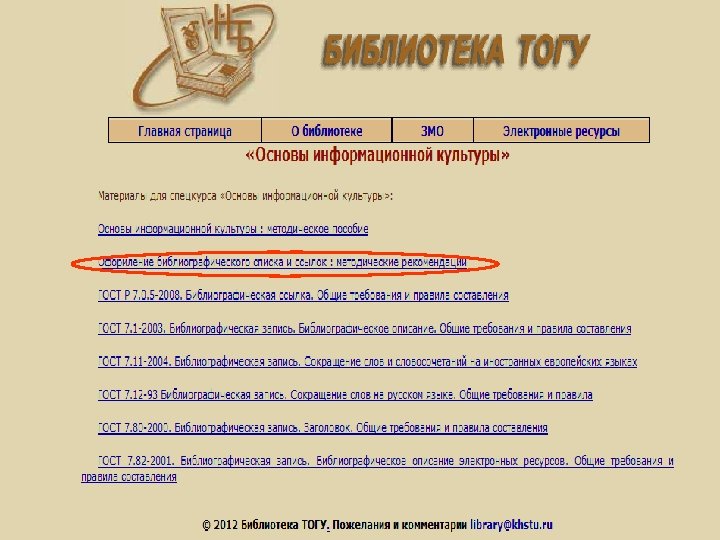 В библиографическом списке описание документов осуществляется в соответствии с ГОСТ 7. 1 -2003 «Библиографическая запись. Библиографическое описание. Общие требования и правила составления» , который действует с 1 июля 2004 г. В настоящее время ссылки оформляются в соответствии с ГОСТ Р 7. 0. 5. -2008 «Библиографическая ссылка. Общие требования и правила составления» (введен с 1 января 2009 г. ). Специально для библиографической обработки электронных документов действует ГОСТ 7. 82 -2001 « «Библиографическая запись. Библиографическое описание электронных ресурсов. Общие требования и правила составления» (введен с 1 июля 2002 г. ). В нем общие правила конкретизированы для электронных ресурсов.