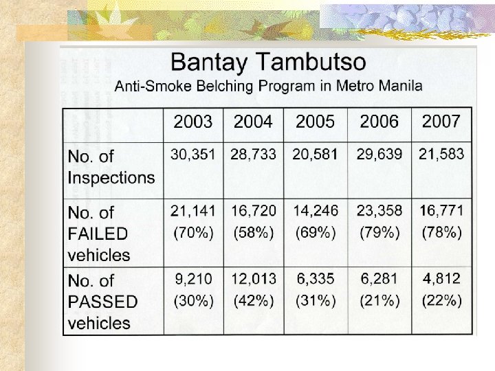 Intensified Anti-Smoke Belching (ASB) Operations n Launched the “Smoke-Free EDSA” Project (2003) Supported by government agencies, civil society and some local government units in Metro Manila, the project aims to reduce the level of air pollution from particulate matter by 20% at the end of 2003. n Launched the Linis Hangin Program (2004) ‘nationwide multi-sectoral campaign to address air pollution. It aims to reduce pollutants, especially TSP, from all sources to acceptable levels by 2010” Ø Ø Ø Linis Tambutso (mobile sources) Linis Tsimineya (stationary sources) Bantay Sunog Basura (area sources)