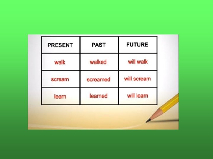 The Past: add –ed to the infinitive Irregular Verbs (sit/sat, go/went, is/was/were) This is when an event has already happened. Forming the simple past tense/Spelling Rules With most verbs, the simple past is created simply by adding -ED. However, with some verbs, you only need to add -D or change the ending a little. Here are the rules: 1. Verb ending in… e Add -D Example: lived dated 2. Consonant + y Change y to i, then add –ED Example: : try tried cry cried 3. One vowel + one consonant (but NOT w or y) Double the consonant, then add -ED tapped committed 4. Any other consonant Add -ED boiled filled handed showed