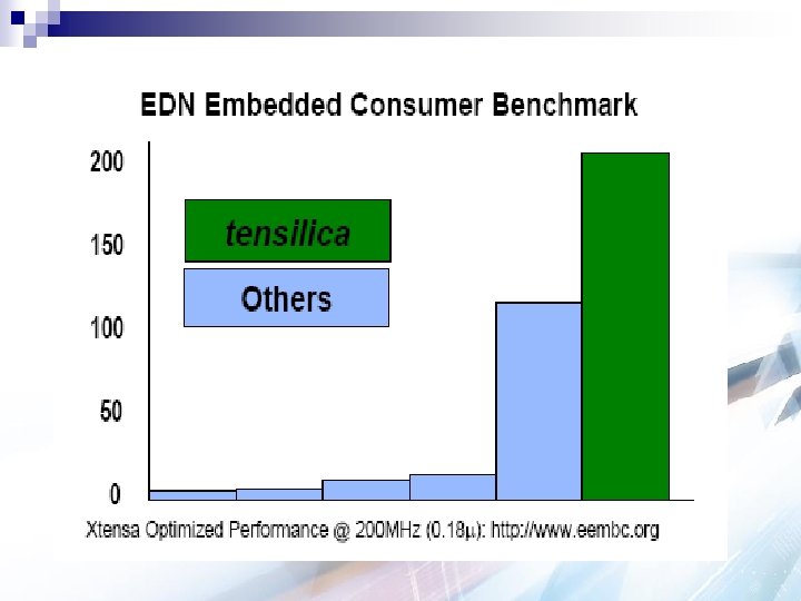 EEMBC Networking Benchmark n n Normalized (per MHz) EEMBC TCPmark Simulates performance in internet enabled client side performance Processor Score Xtensa LX Optimized 1. 62434 Power. PC 760 GX Power. PC MCP 7447 A 0. 4671 Xtensa LX Out of the Box 0. 33762 0. 5856