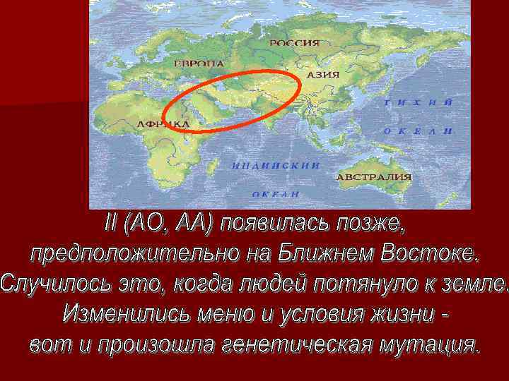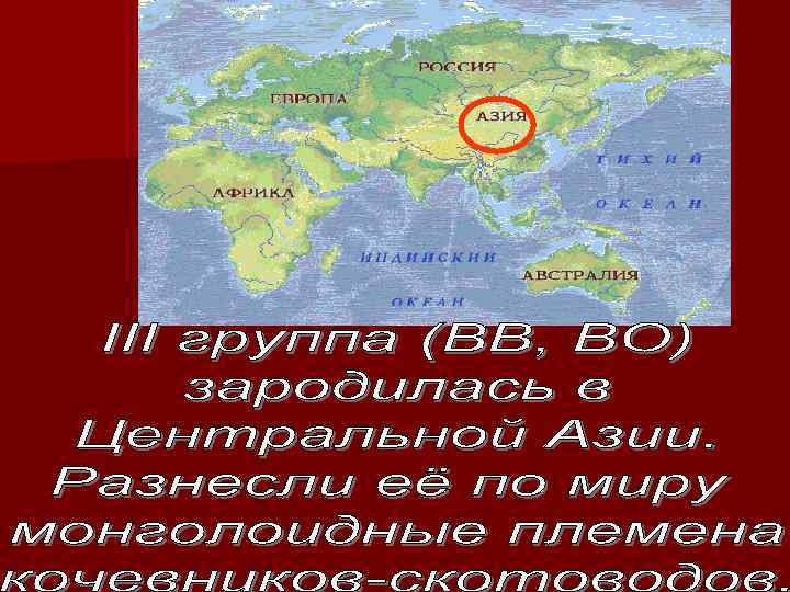 II- в Западной Европе, особенно много её в Германии - 45 % (та самая арийская кровь). III группа в Китае и Монголии, там же чаще попадается редкая IV I группа доминирует у аборигенов Австралии и Полинезии.