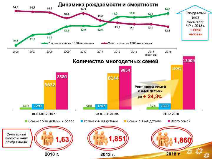 Меры социальной поддержки План мероприятий по повышению рождаемости в Чувашской Республике на 2014 -2018 годы Государственные пособия семьям с детьми, количество получателей 2012 г. 2013 г. 88953 94347 на 01. 12. 2014 79978 Ежемесячная денежная выплата на третьего и последующего ребенка в размере величины прожиточного минимума для детей, до достижения им возраста трех лет, количество получателей 2013 г. 2014 г. на 01. 12. 2014 1791 Ежемесячная денежная выплата на третьего и последующего ребенка в размере величины прожиточного минимума для детей, до достижения им возраста трех лет 3784 4350 2015 г. 6724 2016 г. 7095 2017 г. 2018 г. 7437 7751 Федеральный материнский (семейный) капитал, количество получателей 2011 г. 7650 2012 г. 2013 г. 23, 9 8182 % 6944 2014 г. 8266 Республиканский материнский (семейный) капитал, количество получателей 2012 г. 2013 г. 87 313 на 01. 12. 2014 497 Региональный материнский (семейный) капитал, повышение его демографической эффективности 5, 2 % 2014 г. 560 2015 г. 2016 г. 2017 г. 2018 г. 1600 1650 2460 3660